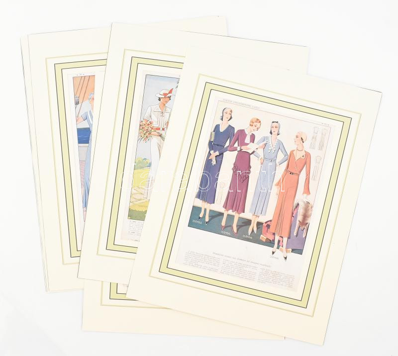 cca 1930 6 db színes art deco női divatkép a Magyar Uriasszonyok Lapjából, ofszet, papír, paszpartuban, 28x20,5 cm