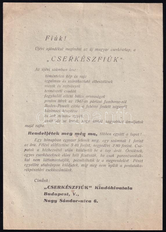 https://www.darabanth.com/en/444-Online-auction/444.0/Art-and-other-collectibles/Scout~500033/1948-Cserkeszfiuk-lap-ketoldalas-propaganda-szorolapja-terjesztesi-jutalmakkal-szep-alla~II2932336