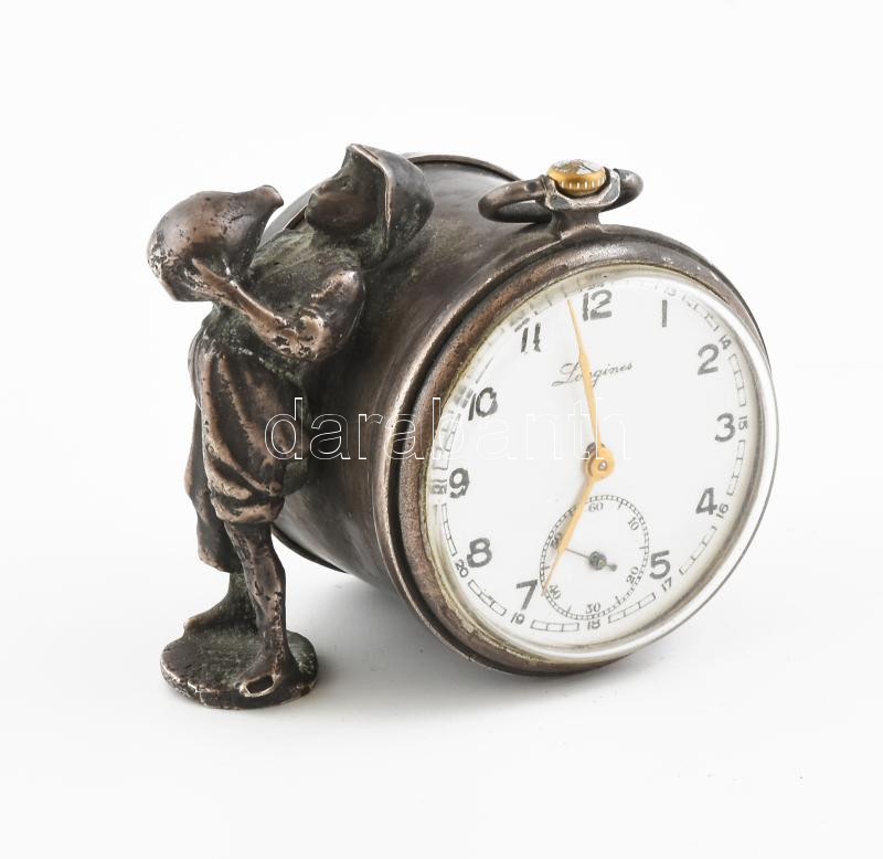 Longines asztali óra, borivó figurával díszített, működik, jelzett, m: 5,5 cm