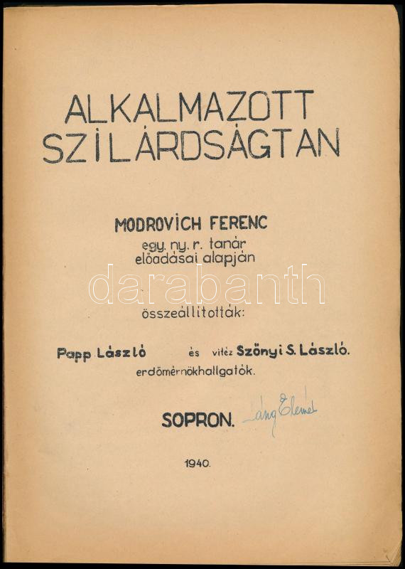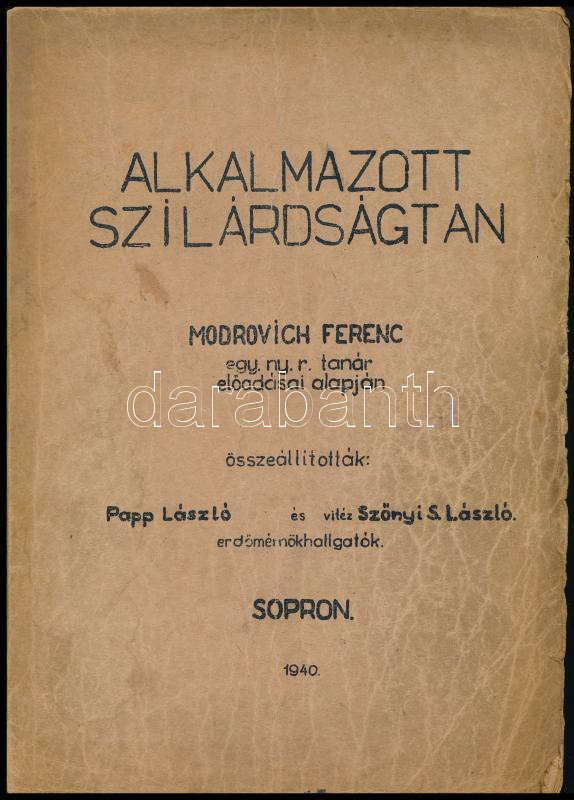 Alkalmazott szilárdságtan. Modrovich Ferenc elÅ‘adásai alapján összeáll.: Papp László és vitéz SzÅ‘nyi S. László erdÅ‘mérnökhallgatók. Sopron, 1940, k.n., 211+(1) p. Kiadói papÃrkötés, kissé viseltes borÃtóval, helyenként ceruzás ill. tollas bejegyzésekkel.