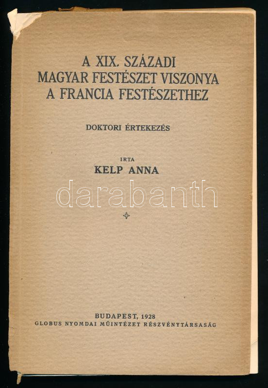 Description: Kelp Anna: A XIX. századi magyar festészet viszonya a francia festészethez. Doktori Értekezés. Bp., 1928., Globus, 119+1 p. Kiadói papírkötés, a gerinc hiányos, az elülső borító leszakadt, a címlapon kis sérüléssel.