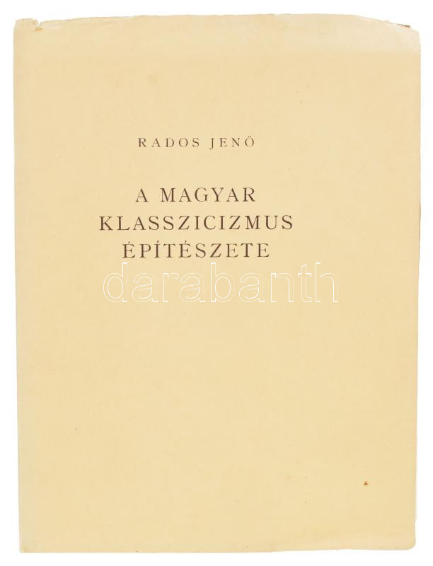 Rados Jenő: A magyar klasszicizmus építészete feladataink tükrében. (Tipológia). Bp, 1943, Franklin-Társulat Nyomdája. Különlenyomat a Zádor Anna és Rados Jenő A klasszicizmus építészete Magyarországon című mű második részéből. Kihajtható térkép-melléklettel. Fekete-fehér képekkel gazdagon illusztrált. Papírborítóban, felvágatlan példány, gerincen és borítón kisebb szakadásokkal.