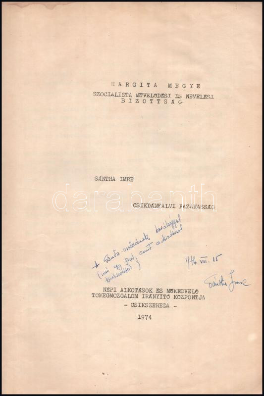 Sántha Imre: Csíkdánfalvi fazekasság. A szerző által DEDIKÁLT példány.... https://www.darabanth.com/en/444-Online-auction/444.0/Books/Books-Architecture-Art~1500014/Santha-Imre-Csikdanfalvi-fazekassag-A-szerzo-altal-DEDIKALT-peldany-Csikszereda-1974-~II2848720