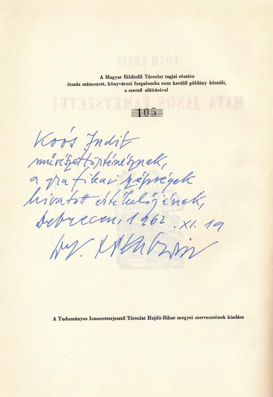 Számozott (105./500) példány. A szerző, Tóth Ervin (1910-1999) által Koós Judit (1923-2006) művészettörténész, műkritikus részére DEDIKÁLT példány.