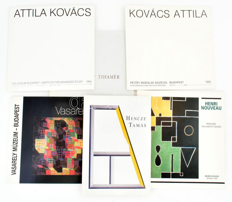 Vegyes művészeti katalógus tétel, 6 db: Henri Nouveau: Peintures Collages et Dessins. Antibes, 1990., Musée Picasso. Francia nyelven. Gazdag képanyaggal. Kiadói papírkötésben.; Hencze Tamás. Hajdu István: Gondolat girlandok Hencze Tamásnak. Formázott képek a 80-as évek elejéről. Bp., 2015., Galéria Neon. Gazdag képanyaggal illusztrált. Magyar és angol nyelven. Kiadói papírkötés.; Vasarely. Bp., 1992., Zichy-kastély. Gazdag képanyaggal illusztrált. Kiadói papírkötés.; Kovács Attila. 60 kétdimenziós vonatkoztatási rendszer. Bp., 1992., PIM. Kiadói papírkötés.; Attila Kovács. 12 systems of reference + 3 metalines. Bp., 1994., Collegium Budapest - Institute for Advanced Study. Kiadói papírkötés.; Gyarmathy Tihamér. Szerk.: Egry Margit, Fitz Péter, Lorányi Judit. Bp., 1995., BTM - Fővárosi Képtár.