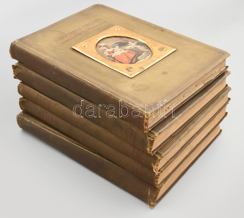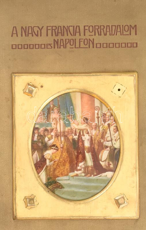 A nagy francia forradalom és Napóleon. I-V. kötet. Teljes!. Írták: Adorján Andor, Kéry Pál, Seress László és Zilahi Kiss Béla. Szerk. Borovszky Samu. Bp.,é. n. (1910 körül), Orsz. Monografia Társ. Szövegközti képanyaggal és önálló táblákkal gazdagon illusztrálva. Kiadói, aranyozott Gottermayer féle egészvászon-kötésben, az elülső kötéstáblákon rézplakettbe foglalt színes képekkel, A II. kötetről a plakett hiányzik. Több kötetről hiányzik egy-két plakett tartó csavar, kopott, borítókkal.