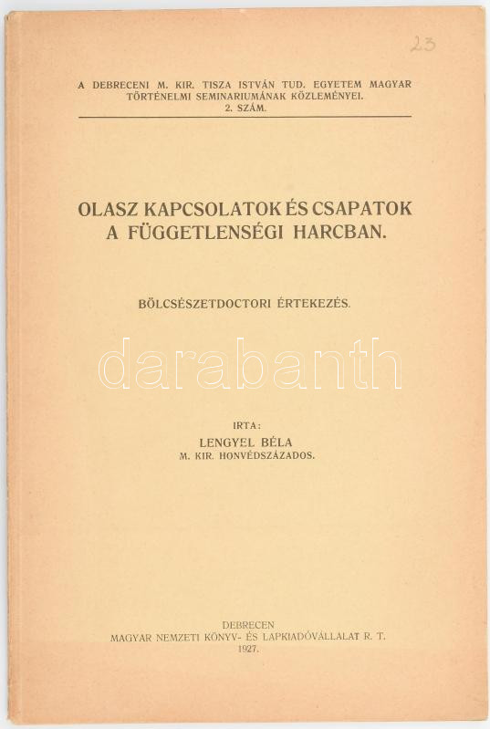 Lengyel Béla: Olasz kapcsolatok és csapatok a függetlenségi harcban. (... https://www.darabanth.com/en/444-Online-auction/444.0/Books/Books-History~1500012/Lengyel-Bela-Olasz-kapcsolatok-es-csapatok-a-fuggetlensegi-harcban-Bolcseszetdoktori-ertek~II2903244