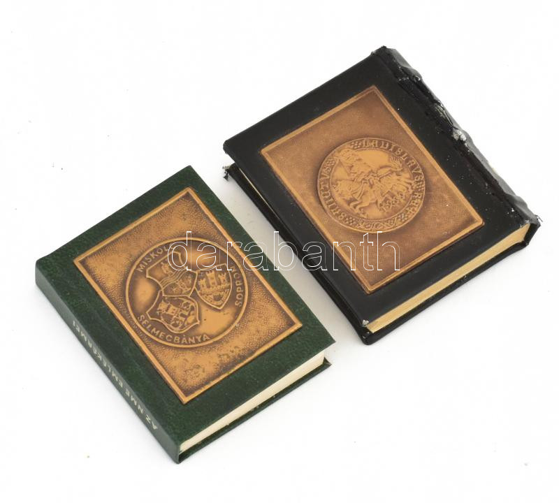 Dr. Gedai István: A magyar középkor pénzverése. Miskolc, 1984. Minikönyv fejjel lefelé rögzített lemezplakett-díszítéssel a külső borítón, készült 800 példányban (ebből 400 számozatlan). Használt állapotban, külső borító a gerincnél sérült. + Horváth Zoltán: A Nehézipari Műszaki Egyetem Emlékérmei. Miskolc, 1985. Minikönyv lemezplakett-díszítéssel a külső borítón, készült 900 számozatlan példányban. Újszerű állapotban. /