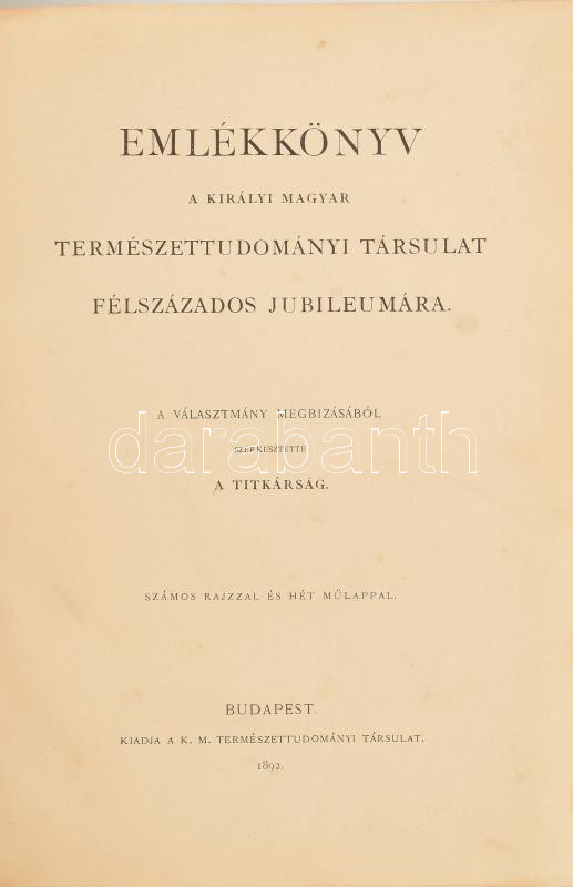 Emlékkönyv a Királyi Magyar Természettudományi Társulat félszázados jubileumára. A választmány megbízásából szerk. a Titkárság. Bp., 1892, K. M. Természettudományi Társulat (Franklin-ny.), (12)+831 p. + 6 t. A Természettudományi Könyvkiadó Vállalat XLVII. kötete. Kiadói aranyozott gerincű, dombornyomott félbőr-kötés, kissé sérült, foltos, kopott borítóval és gerinccel, helyenként kissé foltos lapokkal, lapszéli ázásnyomokkal.