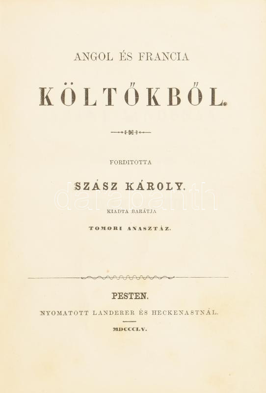 Angol és francia költőből. Ford.: Szász Károly. Kiadta barátja Tomori Anasztáz. Pest, 1855, Landerer és Heckenast, X+326 p. Korabeli aranyozott, illusztrált egészvászon-kötés, aranyozott lapélekkel, kopott borítóval, sérült gerinccel, a könyvtest egyben van,de elvált a borítótól,