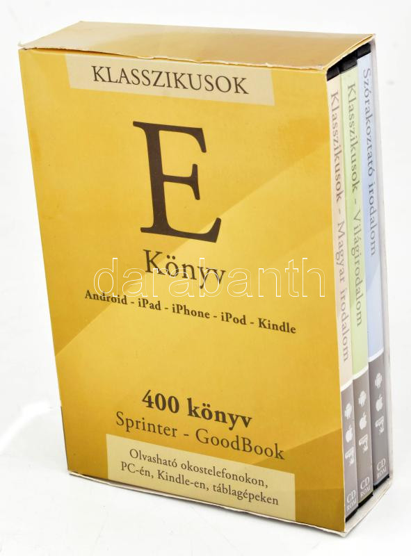 E-köny klasszikusokkal 3 lemezre felosztva. Magyar Irodalom (100 könyv), Világirodalom (150 könyv), valamint Szórakoztató Irodalom (150 könyv). A könyveket többféle eszközön is le lehet játszani.