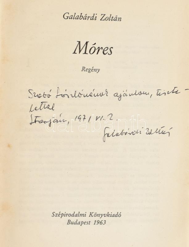 Galabárdi Zoltán: Móres. Bp., 1963, Szépirodalmi Könyvkiadó. Kiadói félvászon-kötés, sérült kiadói papír védőborítóban. A szerző által DEDIKÁLT példány.