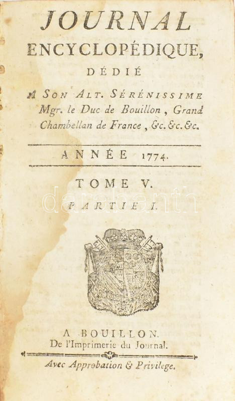 Journal Encyclopédique, Dédié á Son Altesse Sérénissime, Mgr. le Duc de Bouillon, Grand Chambellan de France, &c. &c. &c. Tome V. Bouillon, 1774, De l'Imprimerie du Journal, 378+(2) p. Francia nyelven. Korabeli félbőr-kötésben, sérült gerinccel, helyenként kisebb szúrágta lyukakkal, ázásnyomokkal.