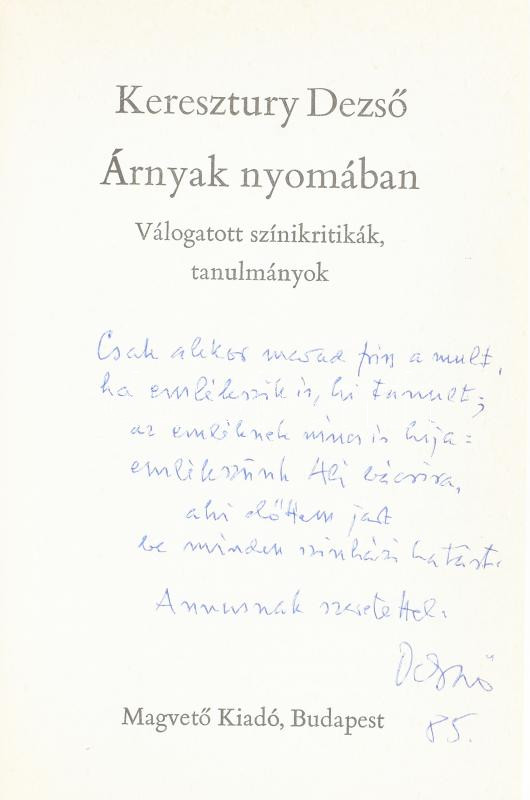 Keresztury Dezső: Árnyak nyomában. Válogatott színikritikák, tanulmányok. A szerző, Keresztury Dezső (1904-1996) Széchenyi-díjas író, költő, irodalomtörténész, kritikus, műfordító által DEDIKÁLT példány! Bp.,1984,Magvető. Kiadói egészvászon-kötés, kiadói papír védőborítóban.