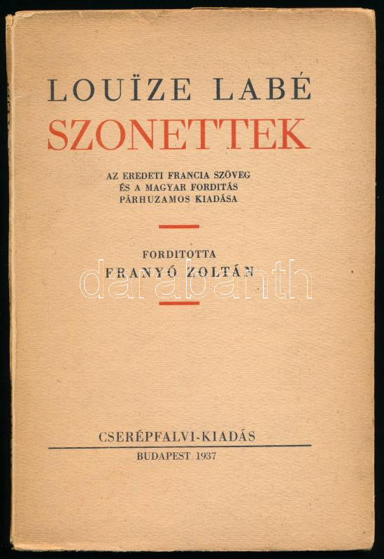 Description: Labé, Louize: Szonettek. Az eredeti francia szöveg és a magyar fordítás párhuzamos kiadása. Ford.: Franyó Zoltán. Bp., 1937, Cserépfalvi, (2)+49+(1) p. Kiadói papírkötés, kissé sérült, nagyrészt felvágatlan lapokkal. Számozott (79./300) példány.