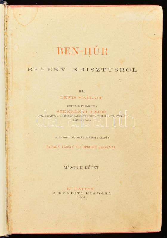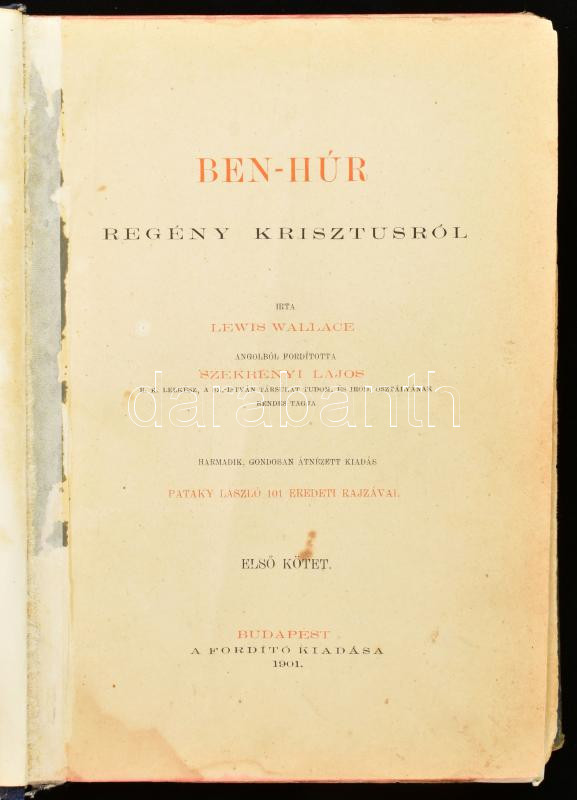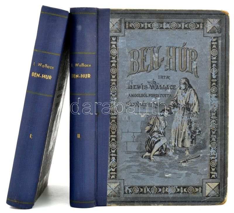 Lewis Wallace: Ben-Húr. I-II. köt. Regény Krisztusról. Ford.: Szekrényi Lajos. Pataky László 101 eredeti rajzával illusztrált. Bp., 1901., Fordítói kiadás, 6+399 p.; 4+397 p. Javított gerincű illusztrált félvászon-kötés, kopott borítóval, restaurált lapokkal, részben foltos lapokkal, néhány lapon aláhúzással.