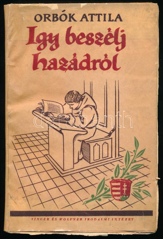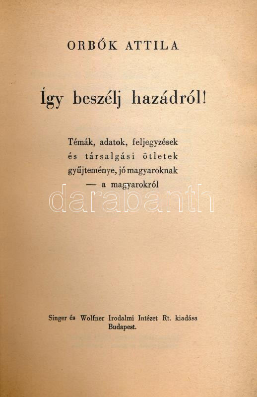 Orbók Attila: Így beszélj hazádról! Témák, adatok, feljegyzések és társalgási ötletek gyűjteménye, jó magyaroknak - a magyarokról. Bp., [1942], Singer és Wolfner, 128 p. Első kiadás. Kiadói illusztrált papírkötés, kissé sérült, javított borítóval.