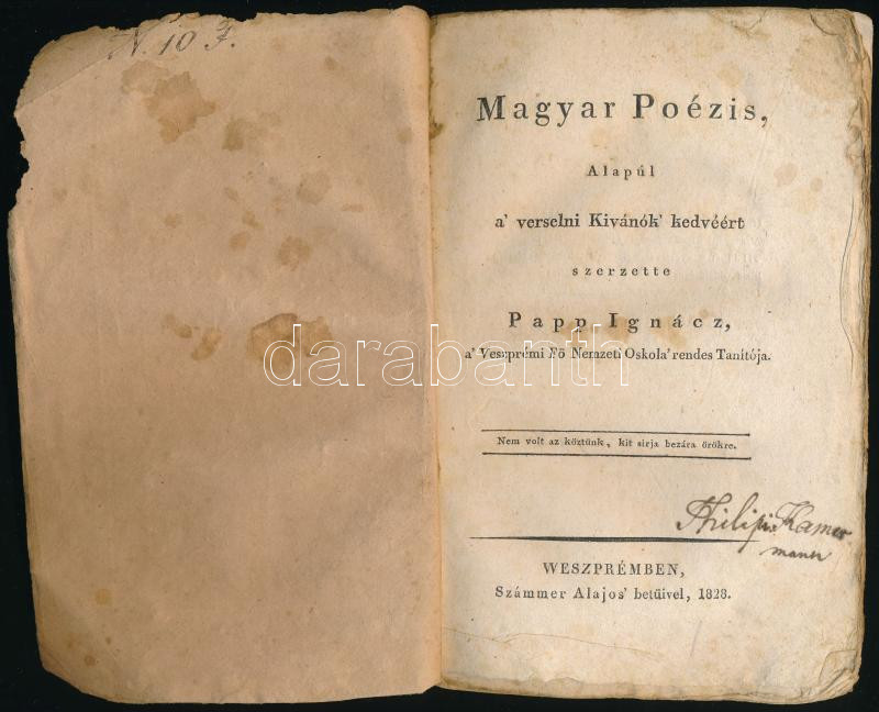 Papp Ignácz: Magyar Poézis, Alapúl a' verselni Kivánók' kedv... https://www.darabanth.com/en/444-Online-auction/444.0/Books/Books-Other-rarities~1500027/Papp-Ignacz-Magyar-Poezis-Alapul-a-verselni-Kivanok-kedveert-szerzette--Weszpremben-~II2904787