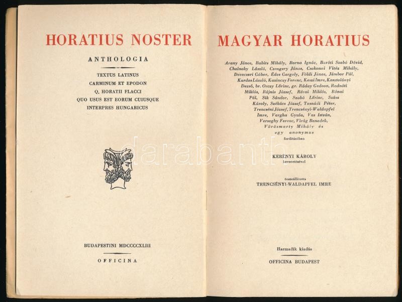 [Quintus Horatius Flaccus:] Magyar Horatius. Horatius Noster Anthologi... https://www.darabanth.com/en/444-Online-auction/444.0/Books/Books-Other-rarities~1500027/Quintus-Horatius-Flaccus-Magyar-Horatius-Horatius-Noster-Anthologia-Osszeall-Trencsenyi-Wa~II2716706