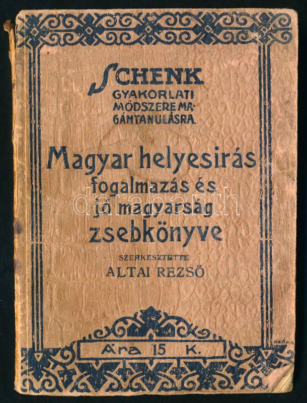 Schenk Magyar helyesirás fogalmazás és jó magyarság zsebkönyve. Szerk: Altai Rezső. Schenk, 1920, sérült kiadói papírkötés