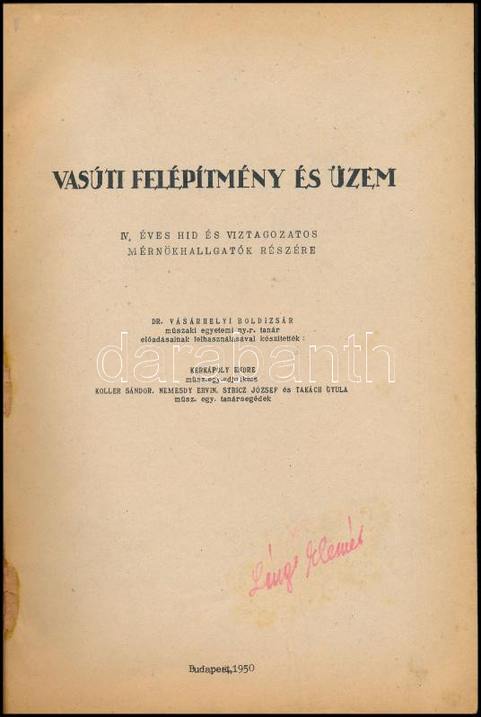Vasúti felépítmény és üzem. IV. éves híd és víztagozatos mérnökhallgatók részére. Dr. Vásárhelyi Boldizsár előadásainak felhasználásával készítették: Kerkápoly Endre et al. Bp., 1950, Typopress, 173+(1)+XVIII p. Szövegközi és egészoldalas ábrákkal illusztrált. Papírkötésben.