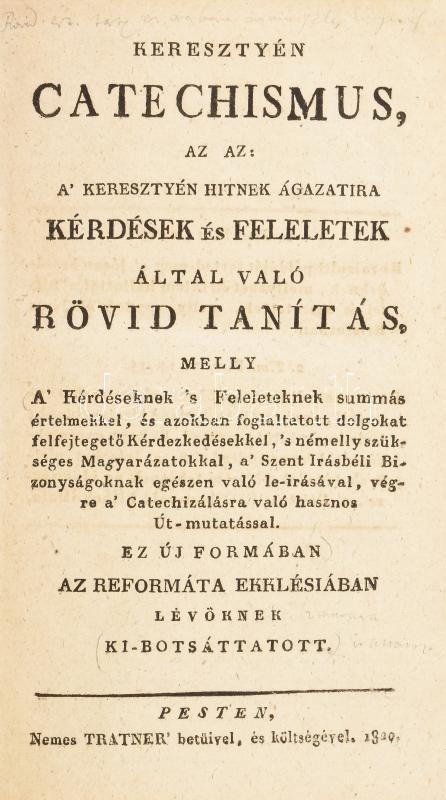 Keresztyén Catechismus, az az: a' keresztyéni hitnek ágazatira való Kérdések és Feleletek által való rövid tanítás, melly ... Pest, 1800 (?), Nemes Tratner (Trattner) betűivel, és költségével, V+8-261 p.+ 53 sztl. lev. Korabeli félbőr-kötésben, kopott borítóval, a gerincen kis sérüléssel, a dátumozás kissé elmosódott, aláhúzásokkal, bejelölésekkel, néhány jegyzettel, 1831-es possessori bejegyzéssel. Ritka!