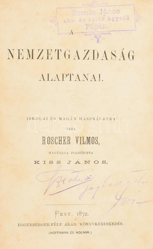 Roscher Vilmos: A nemzetgazdaságtan rendszere. I. köt.: A nemzetgazdaság alaptani. Iskolai és magán használatra írta - -. magyarra fordította Kiss János. Pest, 1872., Eggenberger-féle Akad. Könyvkereskedés (Hoffmann és Molnár), (Pozsony, Wigand K. F. -ny.), XXIV+514+1 p. Korabeli félvászon-kötésben, festett - márványozott díszes lapélekkel, kopott borítóval, tulajdonosi bélyegzésekkel és névbejegyzéssel.