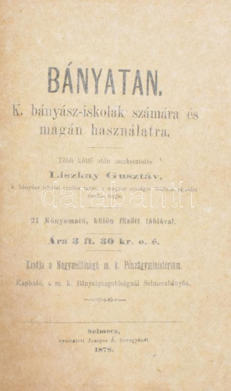 Liszkay Gusztáv: Bányatan. K. bányász-iskolák számára és magán használatra. Kiadja a Nagyméltóságú m. k. Pénzügyministérium. Kapható, a m. k. Bányaigazgatóságnál Selmeczbányán. Selmecz[bánya], 1878., M. Kir. Pénzügyministérium, (Joerges Á[gost]-ny.), 375+1 p. A végén mellékletben 3 kihajtható táblázattal. A címlapon említett 21 kőnyomatú tábla hiányzik. Átkötött modern aranyozott műbőr-kötés, a címlap és az utolsó lap restaurált, ceruzás bejegyzésekkel.