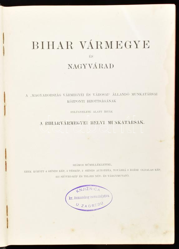Dr. Borovszky Samu (szerk.): Bihar vármegye és Nagyvárad. Magyarország vármegyéi és városai. Magyarország monográfiája. Bp.,é.n., Országos Monográfia Társaság. Kiadói festett egészvászon kötés, festett lapszélek, gerinc szakadt, kopottas állapotban.