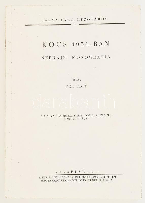 Fél Edit: Kocs 1936-ban. Néprajzi monográfia. Tanya, falu, mezőváros I. köt. Kocs, 1992., Kocs Községi Önkormányzat. Reprint kiadás. Kiadói papírkötésben. Kissé kopott borítón törésnyommal, néhány oldalon ceruzás jelöléssel.