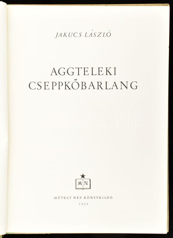 Jakucs László: Aggteleki cseppkőbarlang. Bp., 1952, Művelt Nép. Első kiadás. Egészoldalas, fekete-fehér és színes fotókkal illusztrált. Kiadói félvászon-kötés. Megjelent 5000 példányban.