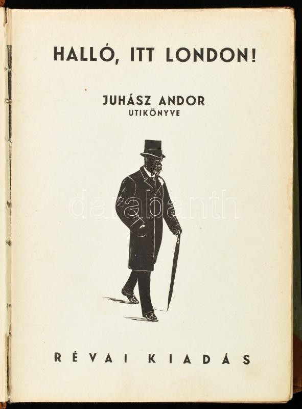 Juhász Andor: Halló, itt London! Bp.,(1933),Révai, 246+2 p. Fekete-fehér fotókkal. A könyv fadúcait Reiter László készítette. Korabeli kopott félbőr-kötés.