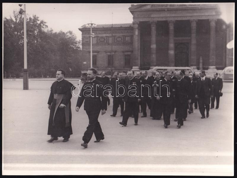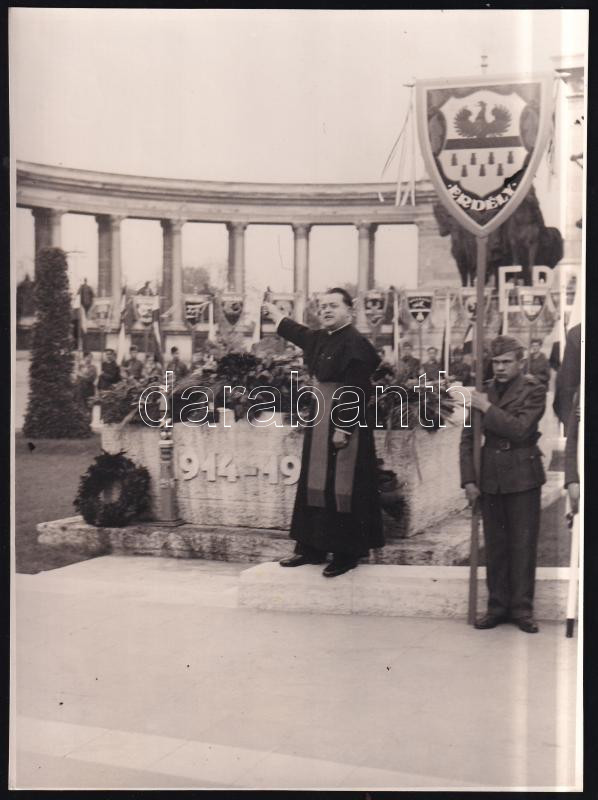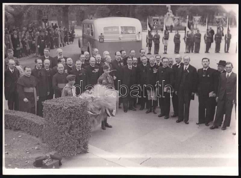 cca 1940 Bp., Bálint József (1901-1988) szentszéki tanácsos, az Erdélyi Római Katolikus Népszövetség igazgatója, a második bécsi döntés után az Erdélyi Párt országgyűlési képviselője a Hősök terén, az ismeretlen katona sírjának megkoszorúzásánál, az Erdélyi Párt más képviselőivel. 3 db nagyméretű fotó, jó állapotban, az egyik a hátoldalon feliratozva, 23x17 cm