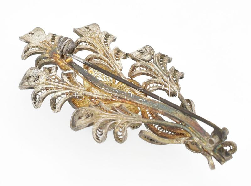 Ezüst (Ag) áttört bross, virágforma díszítményekkel, h: 6 cm, bruttó: 10,28 g