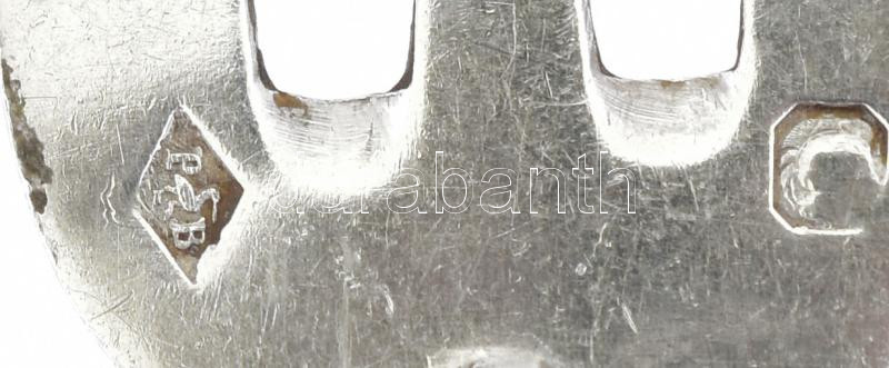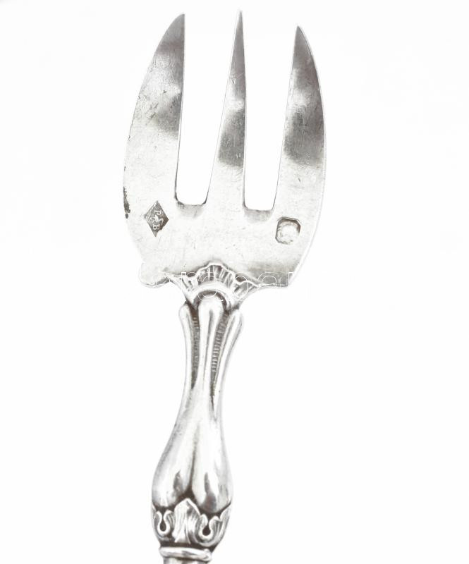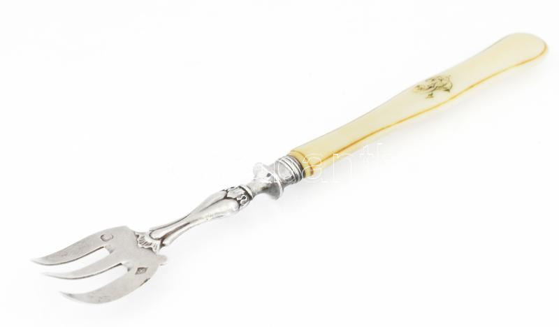 Ezüst (Ag) fejű, csont nyelű szervírozó villa, jelzéssel, h: 14 cm, bruttó: 17 g, sérüléssel