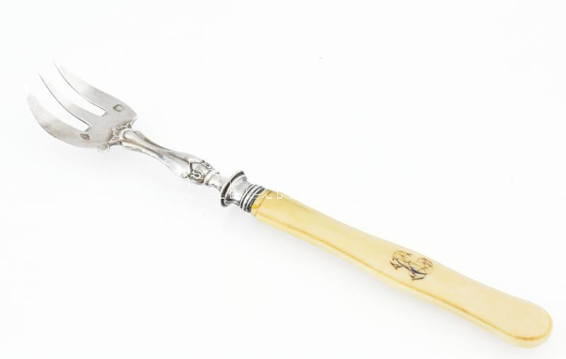 Ezüst (Ag) fejű, csont nyelű szervírozó villa, jelzéssel, h: 14 cm, bruttó: 17 g