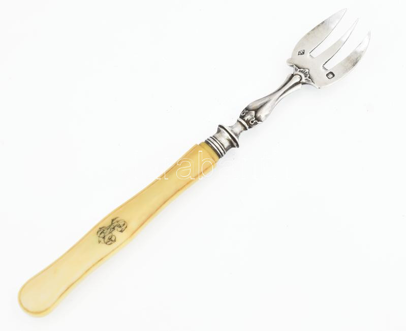Ezüst (Ag) fejű, csont nyelű szervírozó villa, jelzéssel, h: 14 cm, bruttó: 17 g