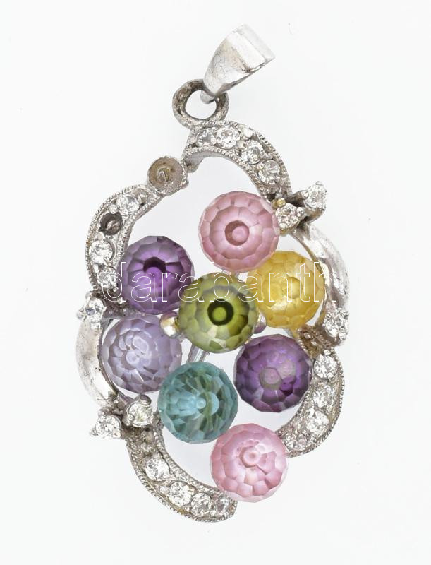 Ezüst(Ag) medál színes gyöngyökkel, jelzett, h: 3 cm, kőhiánnyal, brut...
