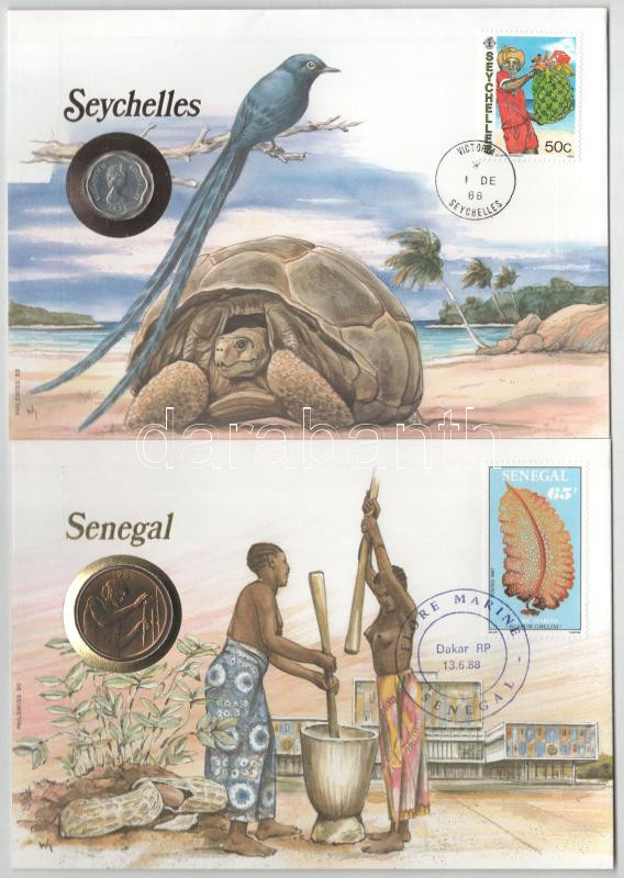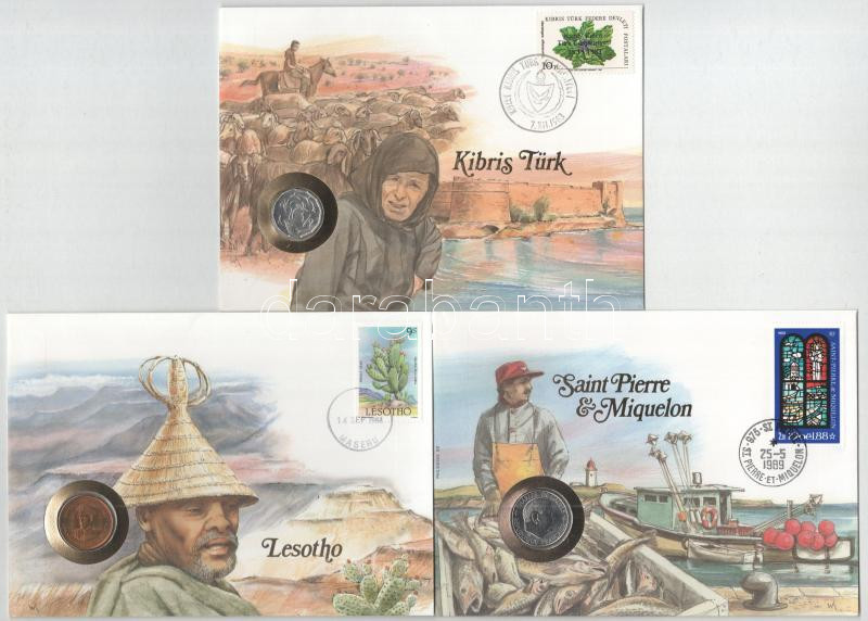 Description: 5db-os érmés boríték tétel, mind különféle és német nyelvű tájékoztatóval, benne: Ciprus, Lesotho, Saint Pierre & Miquelon, Seychelles-szigetek, Szenegál