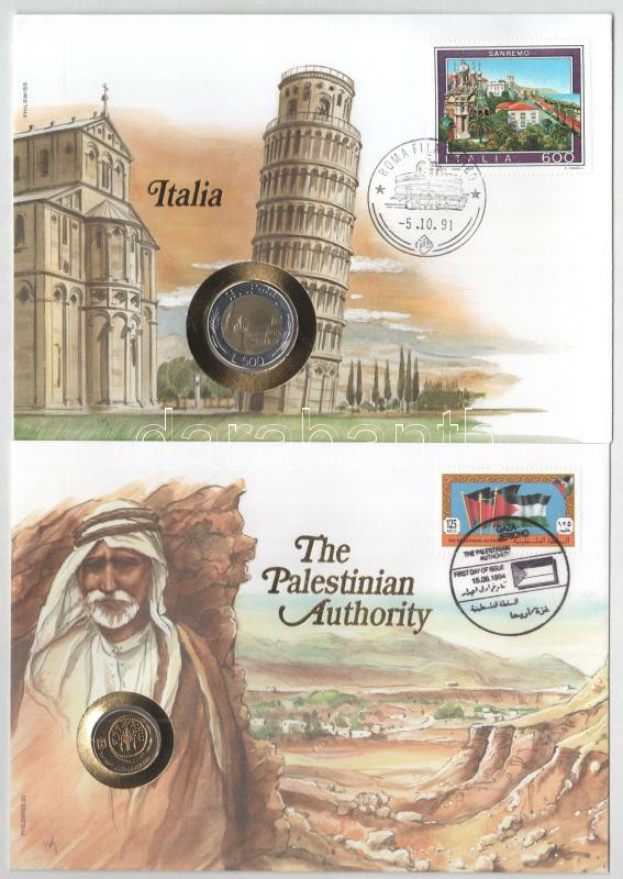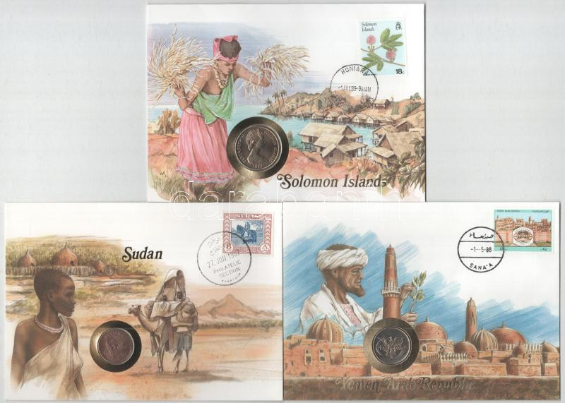 5db-os érmés boríték tétel, mind különféle és német nyelvű tájékoztatóval, benne: Salamon-szigetek, Szudán, Jemen, Olaszország, Palesztin Hatóság