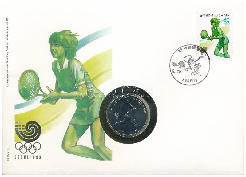 Dél-Korea 1987. 1000W Cu-Ni "XXIV. Nyári Olimpia 1988. Szöul - Tenisz" forgalomba nem került emlékkiadás felbélyegzett borítékban, bélyegzéssel, német nyelvű tájékoztatóval T:UNC