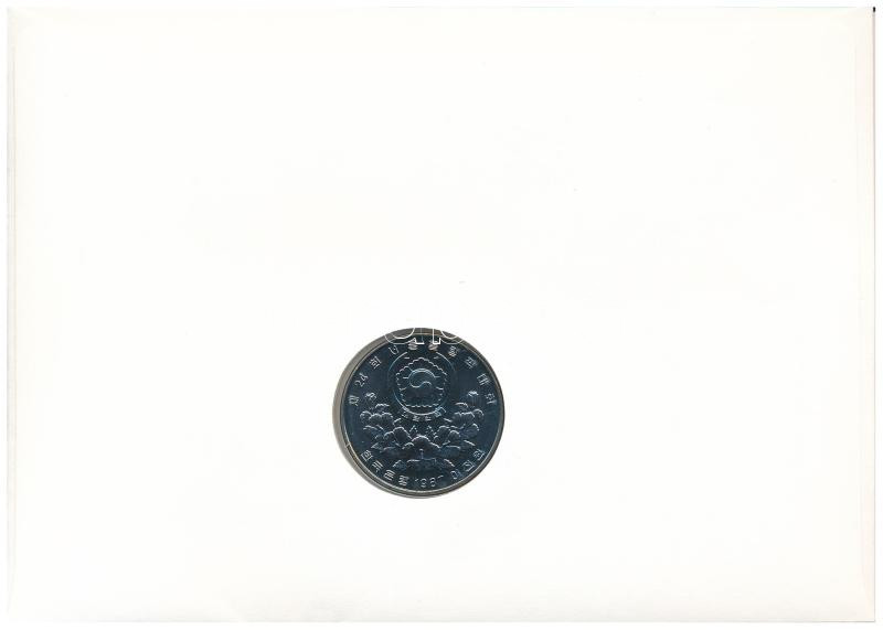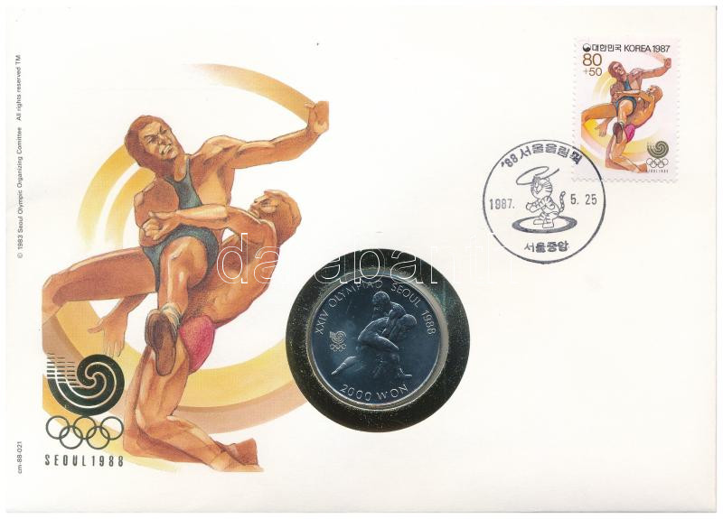South Korea 1987. 2000 Won steel "XXIV Summer Olympics 1988 Seoul - Wrestling" non-circulating commemorative coin in envelope with stamp, cancellation and a prospectus in german C:UNC