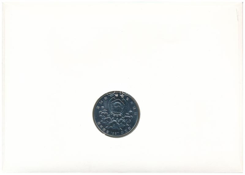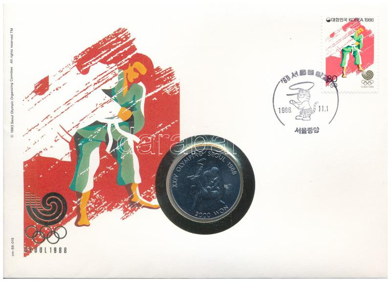 South Korea 1987. 2000 Won steel "XXIV Summer Olympics 1988 Seoul - Judo" non-circulating commemorative coin in envelope with stamp, cancellation and a prospectus in german C:UNC