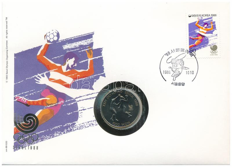South Korea 1988. 1000 Won Cu-Ni "XXIV Summer Olympics 1988 Seoul - Handball" non-circulating commemorative coin in envelope with stamp, cancellation and a prospectus in german C:UNC