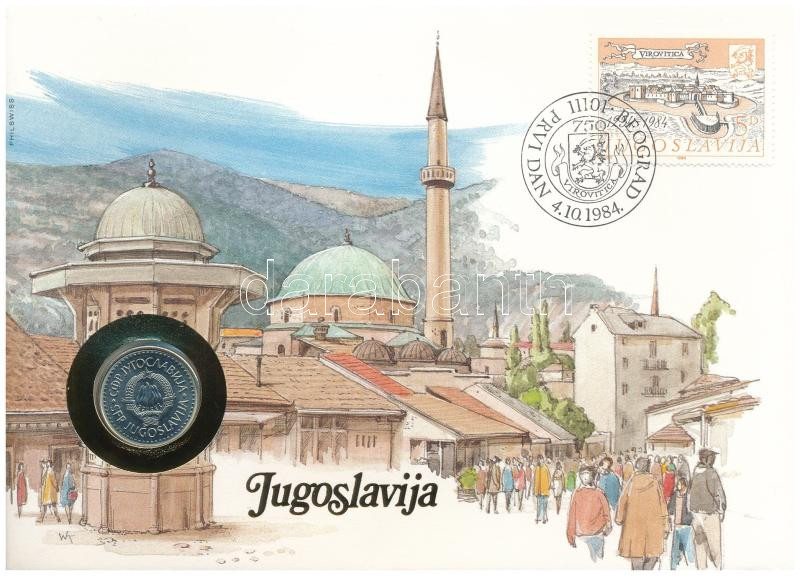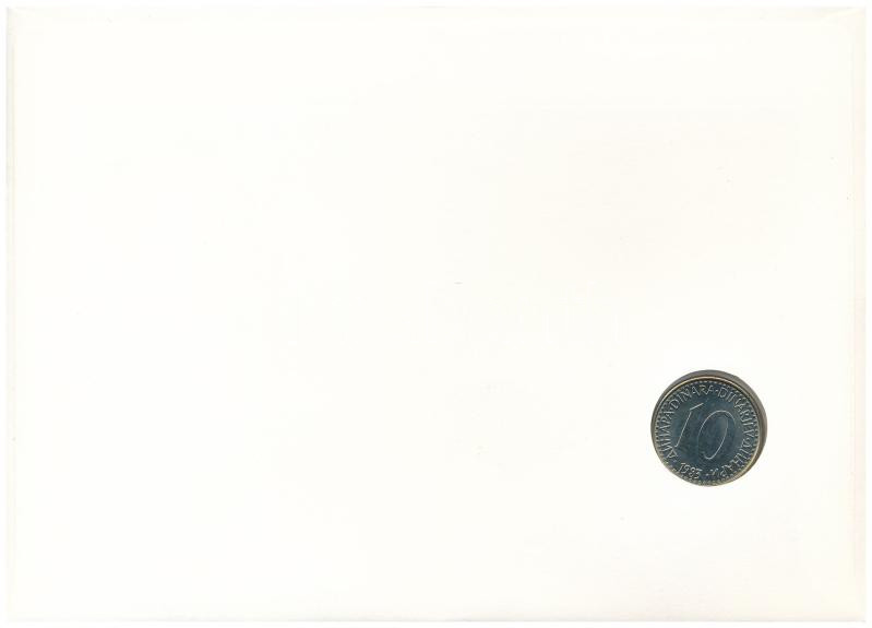Description: Jugoszlávia 1983. 10D Cu-Ni technológiai hibás veret (kb. 20 fokkal elfordult hátlap), felbélyegzett borítékban, bélyegzéssel, német nyelvű tájékoztatóval T:UNC Yugoslavia 1983. 10 Dinara Cu-Ni technological error (rotation on the back) in envelope with stamp, cancellation and a prospectus in german C:UNC