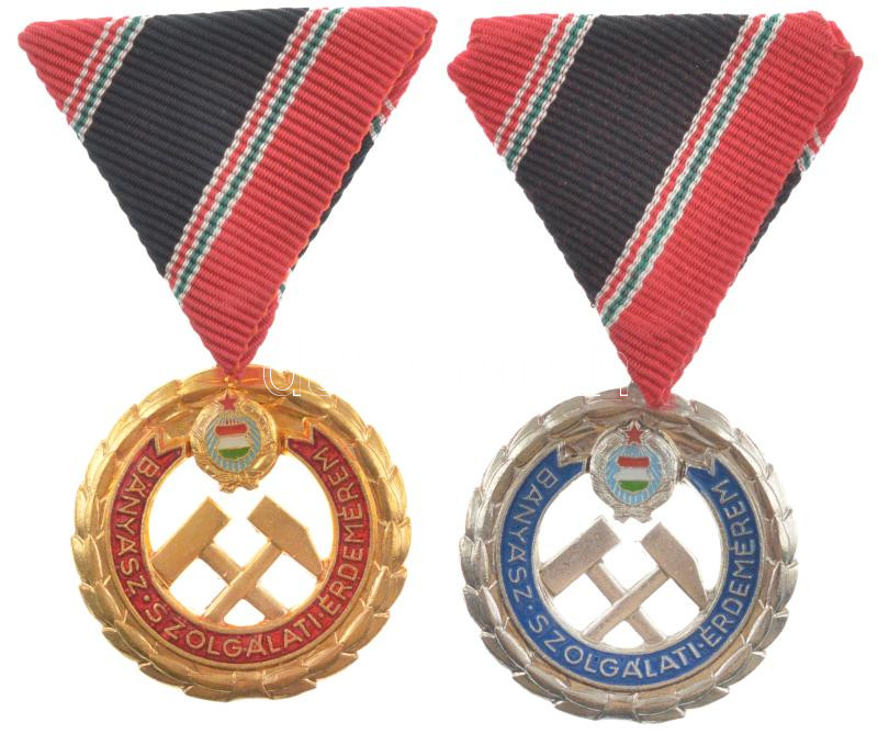 1957. "Bányász Szolgálati Érdemérem arany és ezüst fokozata" aranyozott, zománcozott fém kitüntetések mellszalagon T:1- NMK.: 669.
