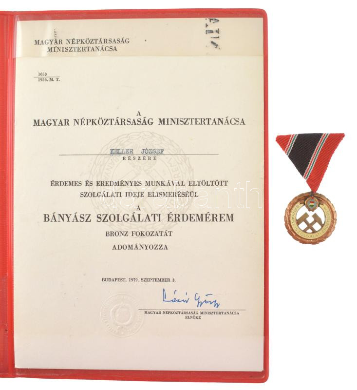1979. "Bányász Szolgálati Érdemérem bronz fokozata" műgyantás fém kitüntetés mellszalagon, adományozói lappal T:XF