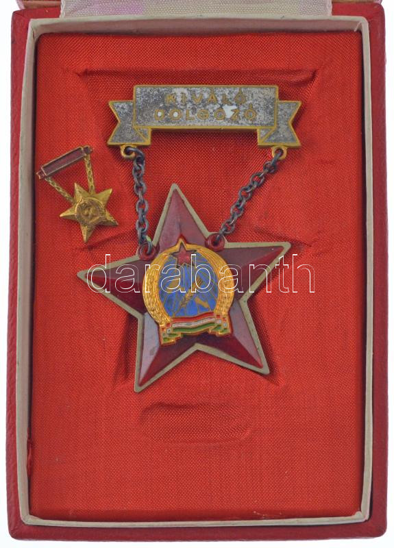~1950. "Kiváló Dolgozó" Rákosi-címeres zománcozott kitüntetés, eredeti Rákosi-címeres tokban, miniatűrrel T:XF,VF zománchiba