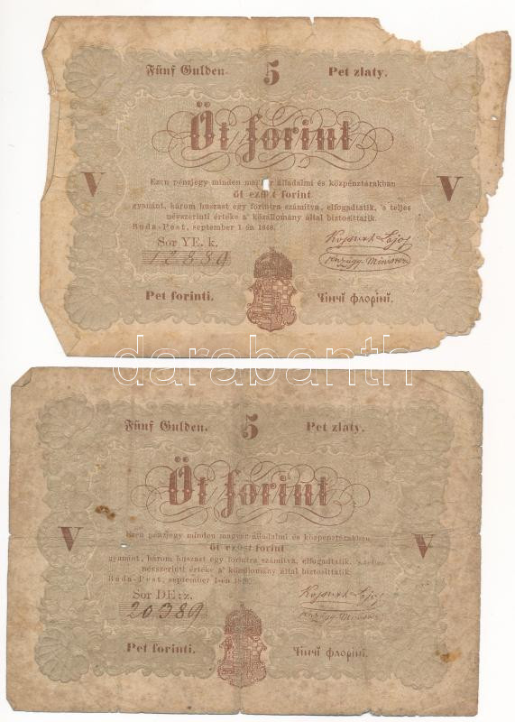 https://www.darabanth.com/en/444-Online-auction/444.0/Numismatics/Hungarian-Banknotes~1000007/1848-5Ft-Kossuth-banko-barna-nyomat-2x-TVG-fo-aranyghiany-Adamo-G109A~II2932682