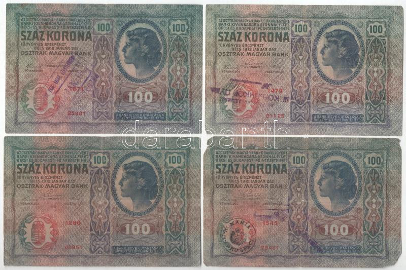 1912. 100K (4xklf) különböző, magyar, román és orosz felülbélyegzésekk...